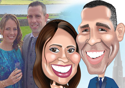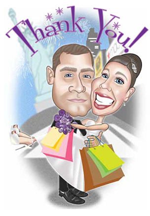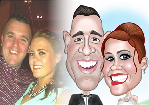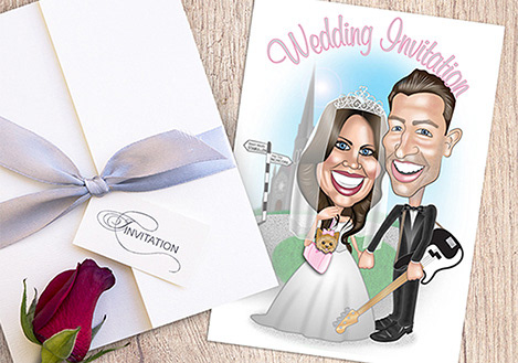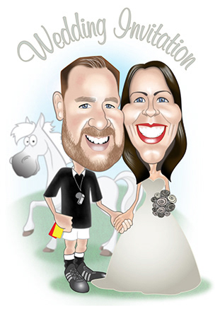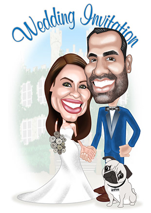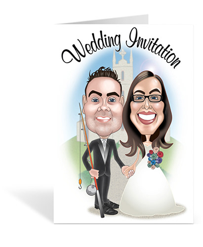While looking for work as a Graphic Designer I ran a small business creating Caricature Wedding Invitations. Using Adobe Illustrator and Photoshop I created caricatures based on photos provided by the couple. Once the Caricature was approved, I created the Wedding Invitation in In Design and sent the PDF to my local Printer to print on Glassy Folded Card.